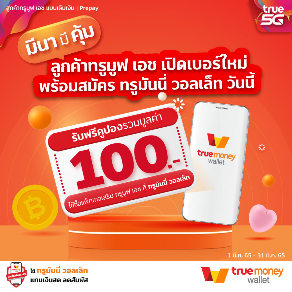 มี.ค.32022บริการอื่นๆ เปิดเบอร์ใหม่ พร้อมสมัคร ทรูมันนี่ วอลเล็ท วันนี้รับฟรีคูปองรวมมูลค่า 100 บาท ใช้ซื้อแพ็กเกจเสริม ทรูมูฟ เอช ที่ทรูมันนี่ วอลเล็ท ตั้งแต่วันที่ 1 มีนาคม 2565 – 31 มีนาคม 2565 ขอรับรหัสผ่าน เพื่อเข้าใช้งานซื้อแพ็กเกจทรูมูฟ เอช