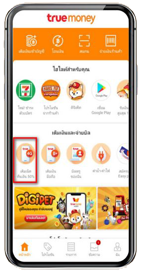 1.เข้าแอป ทรูมันนี่ วอลเล็ท เลือกเมนู “เติมเน็ต”