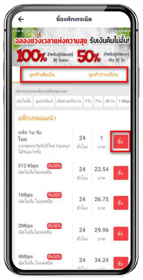 2.เลือก “ลูกค้าเติมเงินหรือลูกค้ารายเดือน” แล้วเลือกแพ็กเกจเน็ตที่ต้องการ และกดปุ่ม “ซื้อ”